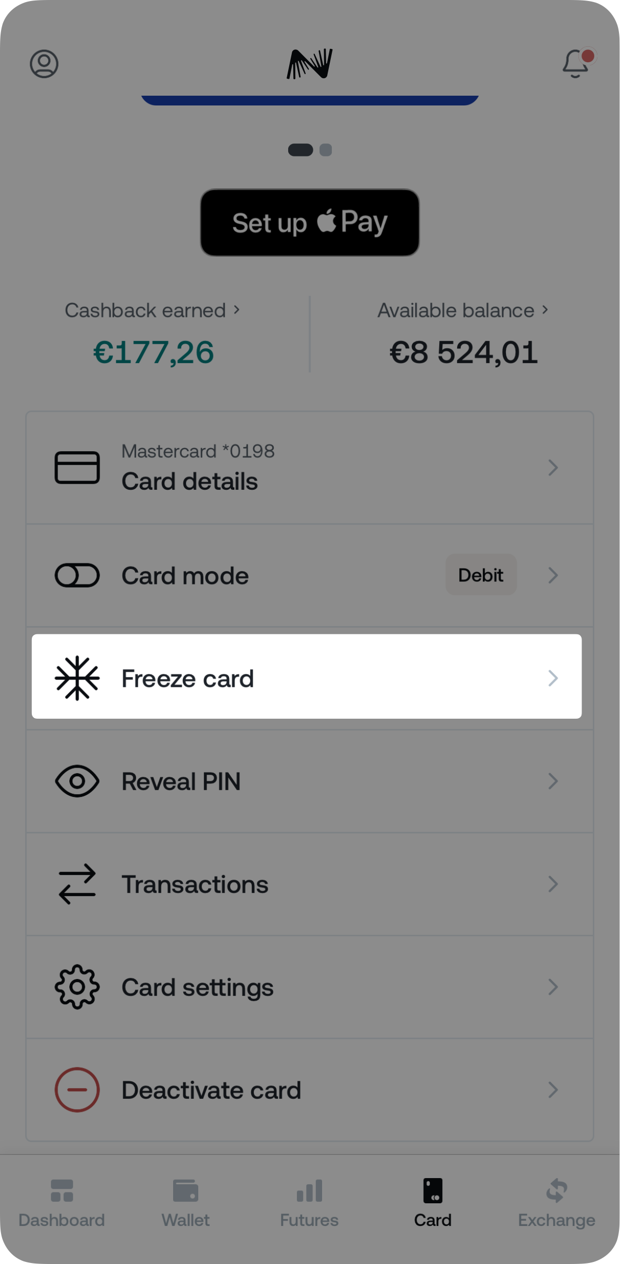 When your Nexo Card is not in use, you can easily freeze it through the app. Here’s how: