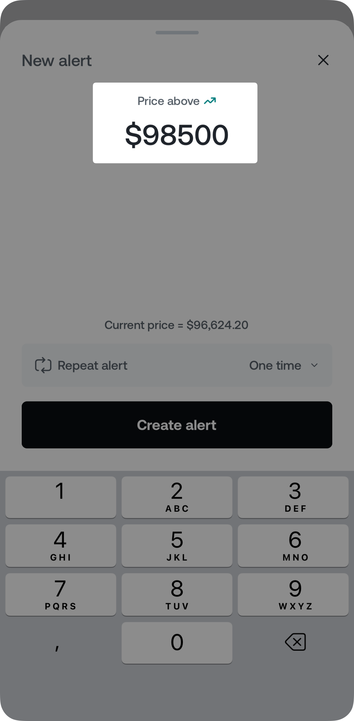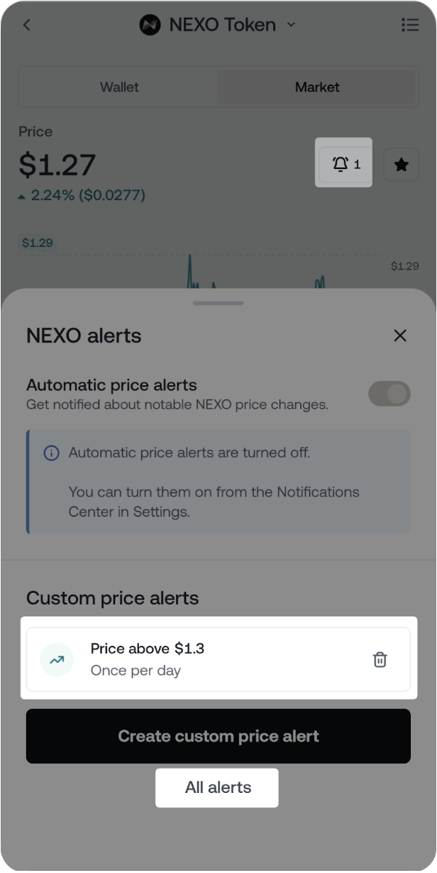 Congratulations! Your custom price alert is now set. You can view or delete your active price alerts via the bell icon in the asset’s Market tab. To check all active custom alerts, tap All alerts.