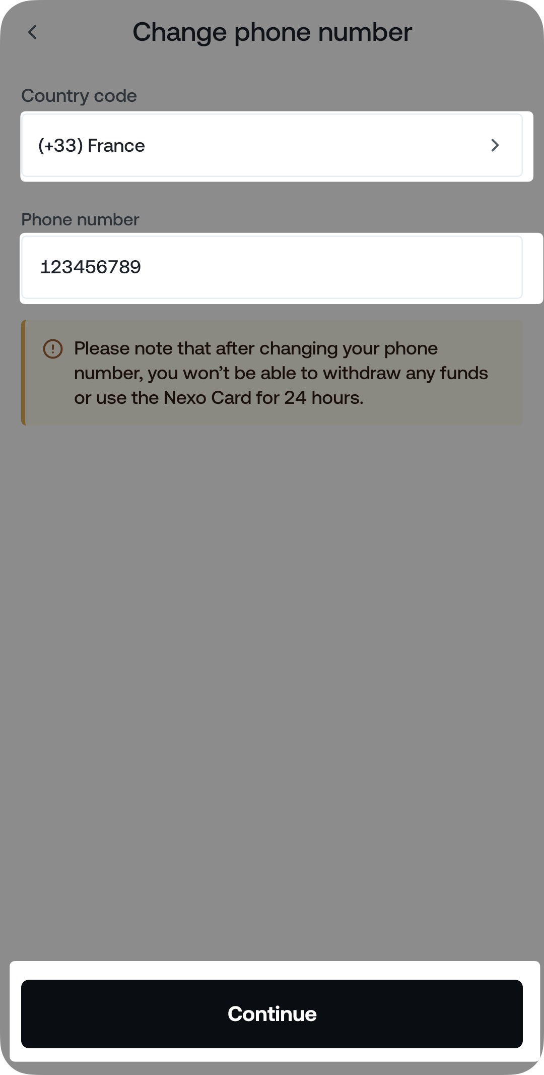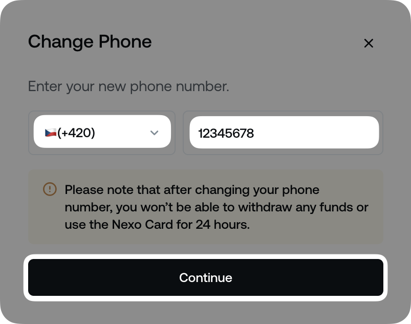 Note: For security reasons, you will not be able to make any withdrawals (FIATx or crypto) or use your Nexo Card for 24 hours after changing your phone number.