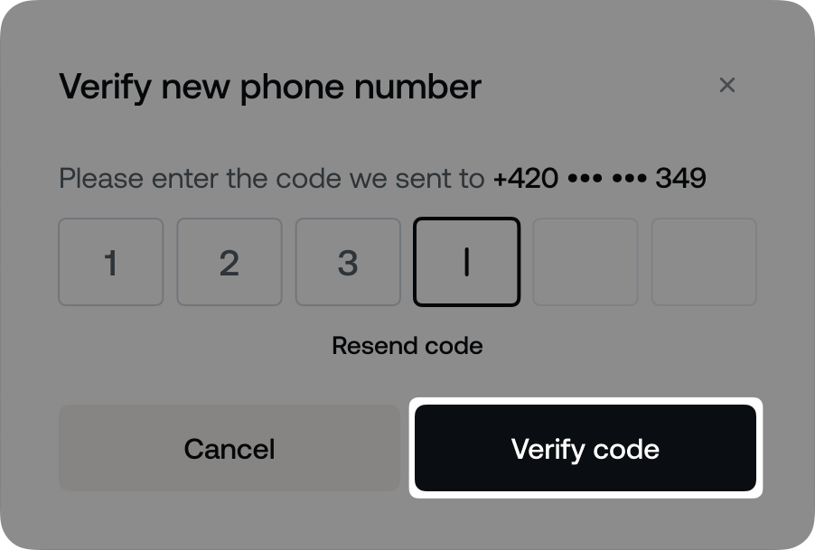 6. Authorize the operation by entering the 6-digit security code sent to the new phone number you selected and tap Verify code.