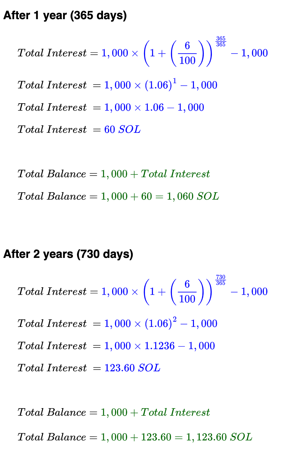 Suppose you are a Platinum Tier user with 1,000 SOL in a fixed term and have opted to earn interest in-kind (in SOL). In that case, you’ll have an annual interest rate of 6% (5% plus 1% fixed-term bonus) under the compound interest model.