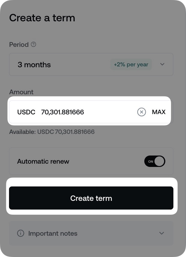 3. Enter the desired amount and duration (when applicable), and click Create term to complete the process.