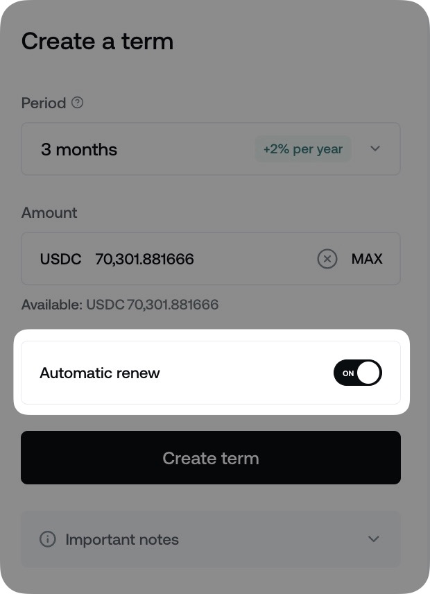 • Extended yield: By enabling the Automatic renewal option, you can effortlessly extend the length of your term.