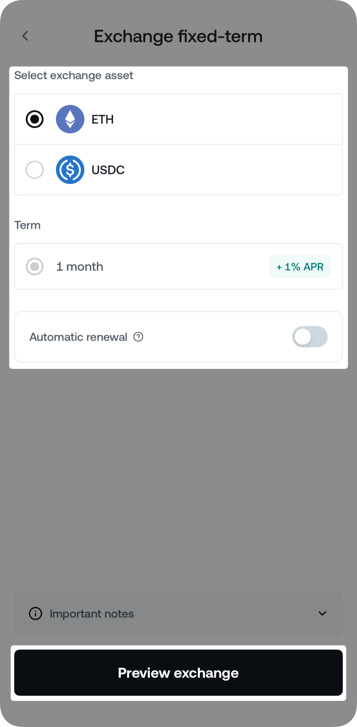 3. On the next screen, select the asset for which you wish to exchange your term, the term duration (if applicable), and whether the new fixed term should automatically renew when it matures. Make sure to read the Important notes section, and tap Preview exchange to proceed.