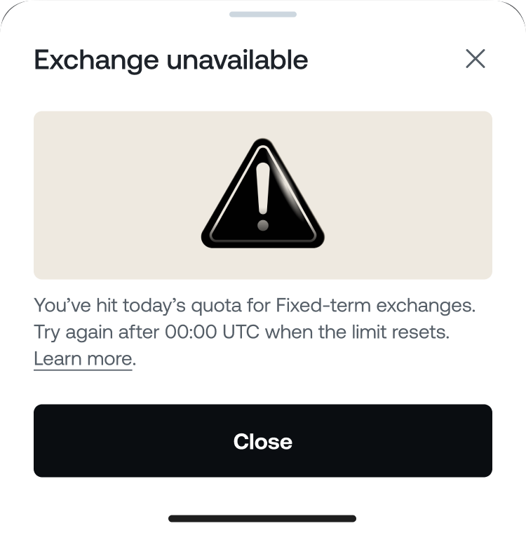 Example: If you have an active fixed term in BTC and the BTC daily quota has already been filled, you will not be able to exchange that BTC term for USDC or ETH until the next reset.