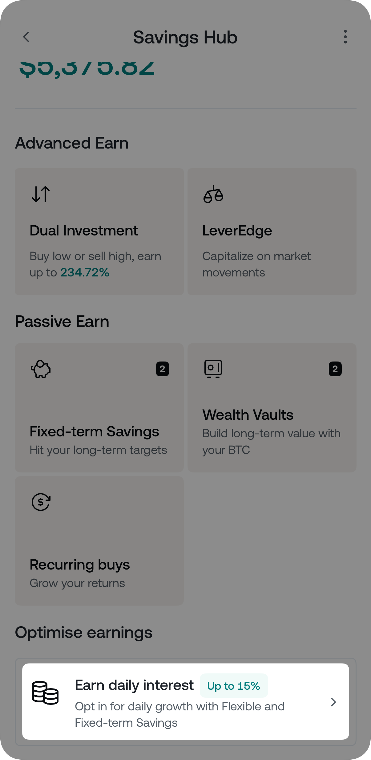 Both Flexible and Fixed-term Savings are available for a wide range of digital assets. However, not all currencies earn interest or can be locked in Fixed-term Savings.