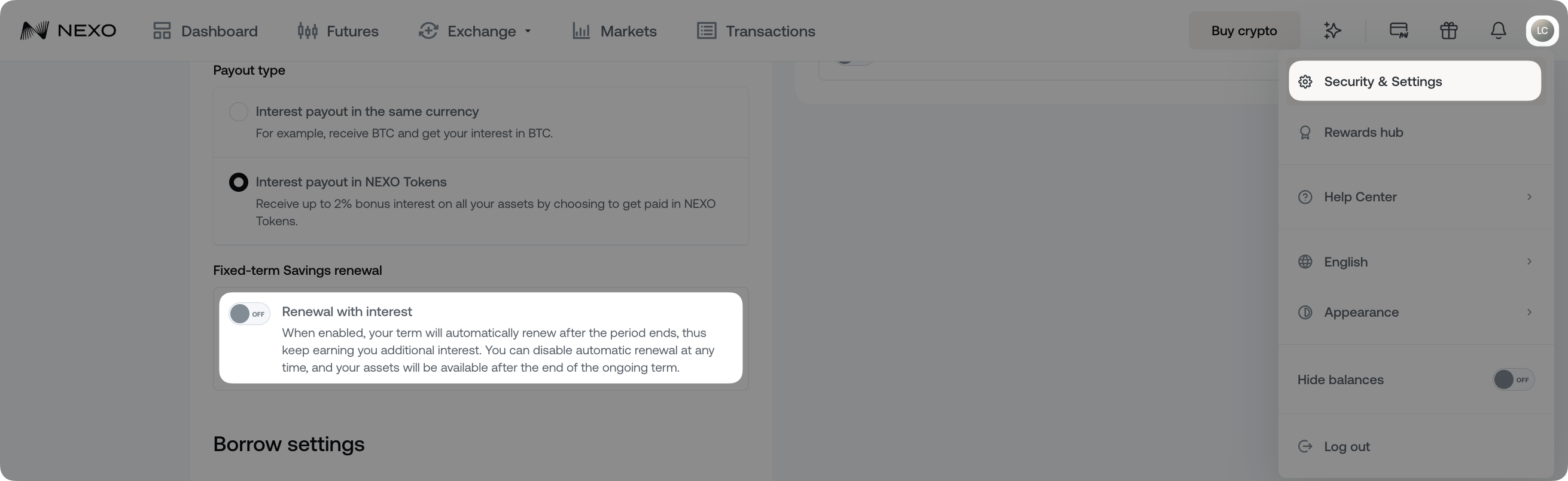 To do so, navigate to My profile > Security & Settings > Settings on the Nexo app/web platform and enable the Renewal with interest toggle. Once enabled, this feature will apply to all your current and future terms.