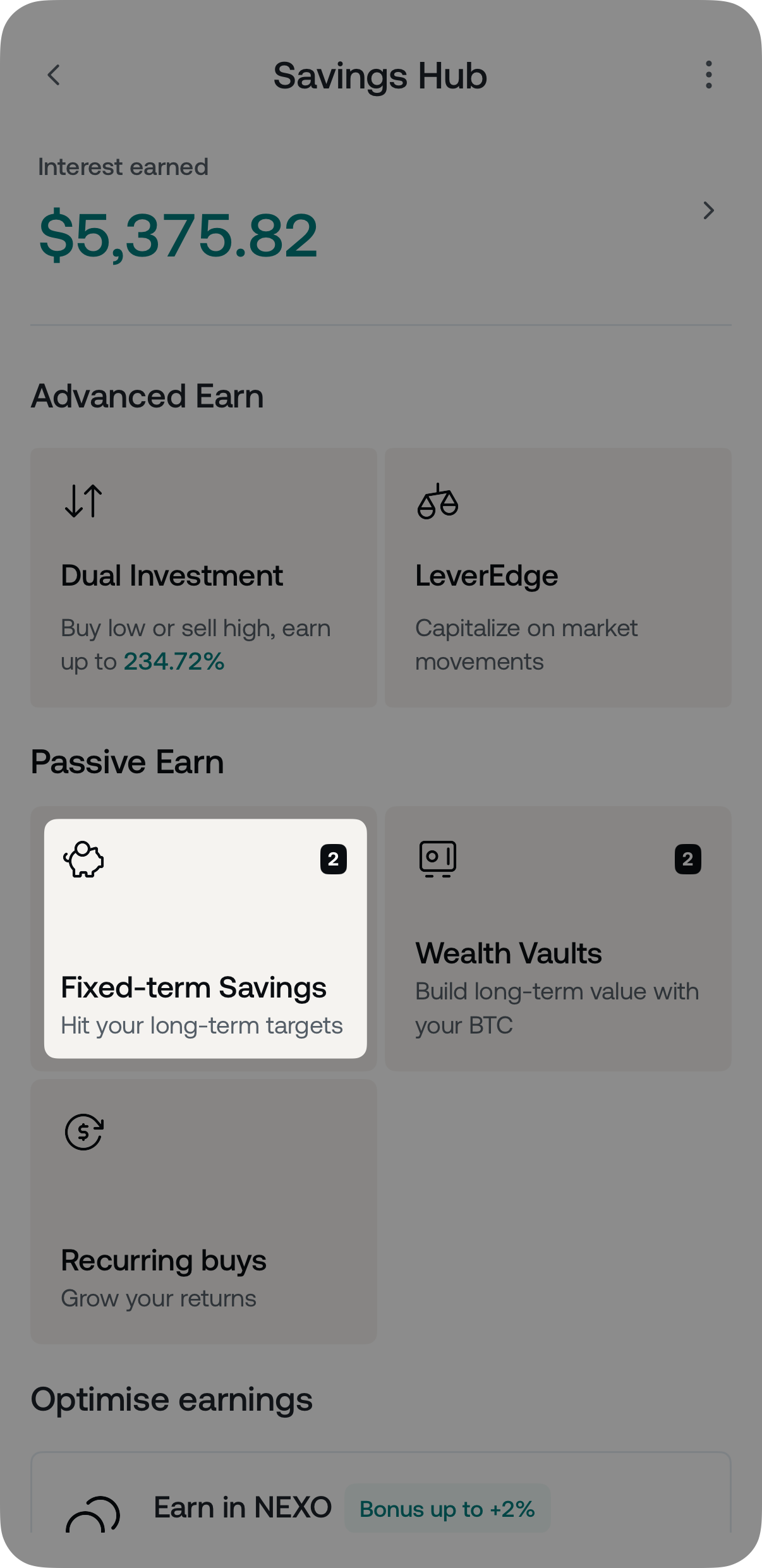 • Flexible HODLing: You can have up to 50 terms per asset simultaneously, which allows you to add more assets to your Fixed-term Savings and earn Nexo’s yields without waiting for your previous terms to expire.