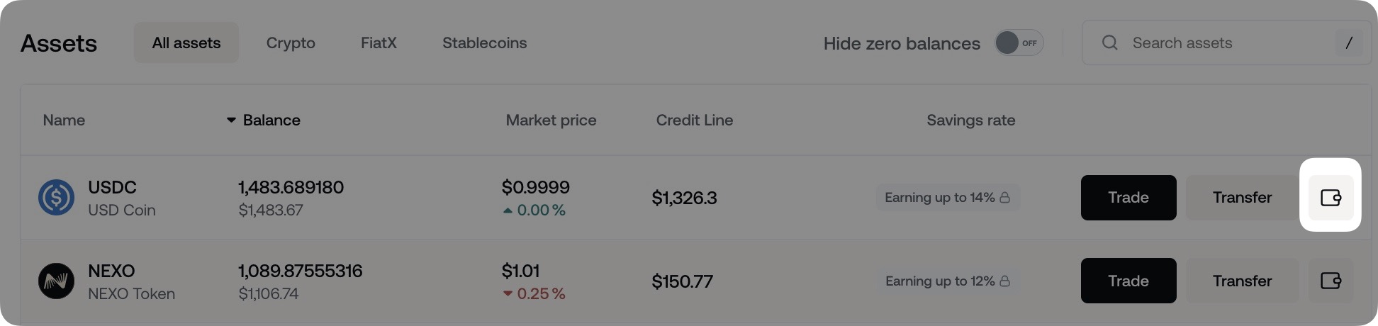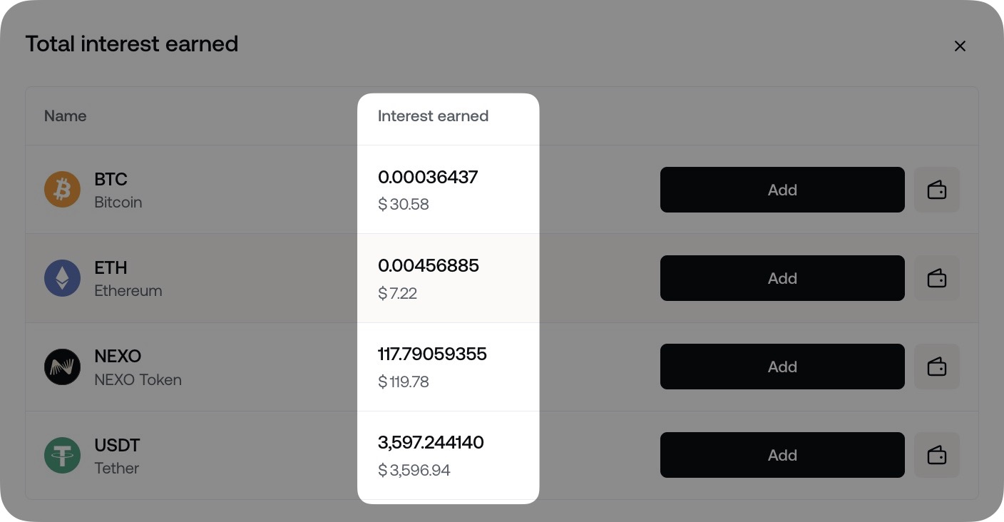 To earn interest, assets must be held in your Savings Wallet. The only exception is the NEXO Token, which earns interest in both the Savings and Credit Wallets.