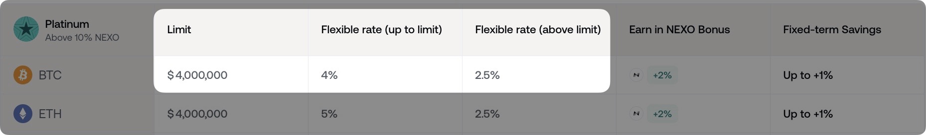 Example: If your Loyalty Tier is Platinum and you have $5M USD worth of BTC in Flexible Savings, you earn 4% per year on the first $4M and 2.5% per year on the remaining M.