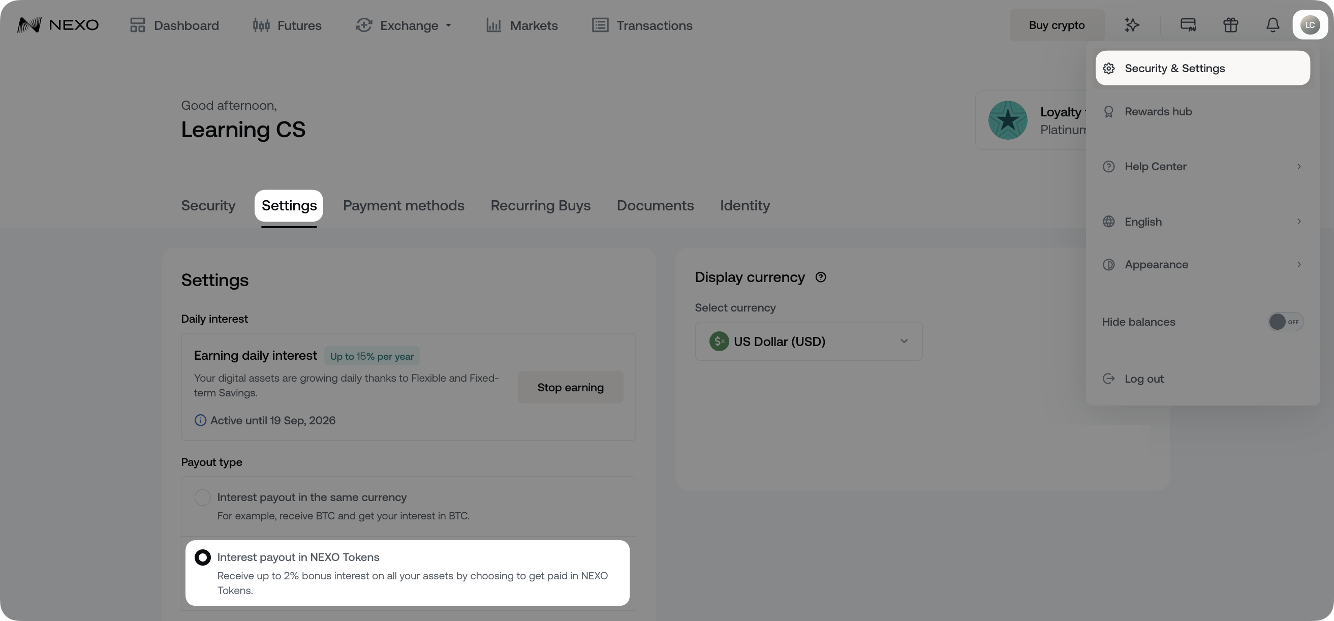 When choosing to earn in NEXO Tokens, you receive between a 0.25% and 2% bonus interest rate, depending on your Loyalty Tier. To activate the option, follow these steps: