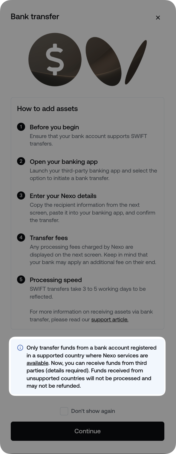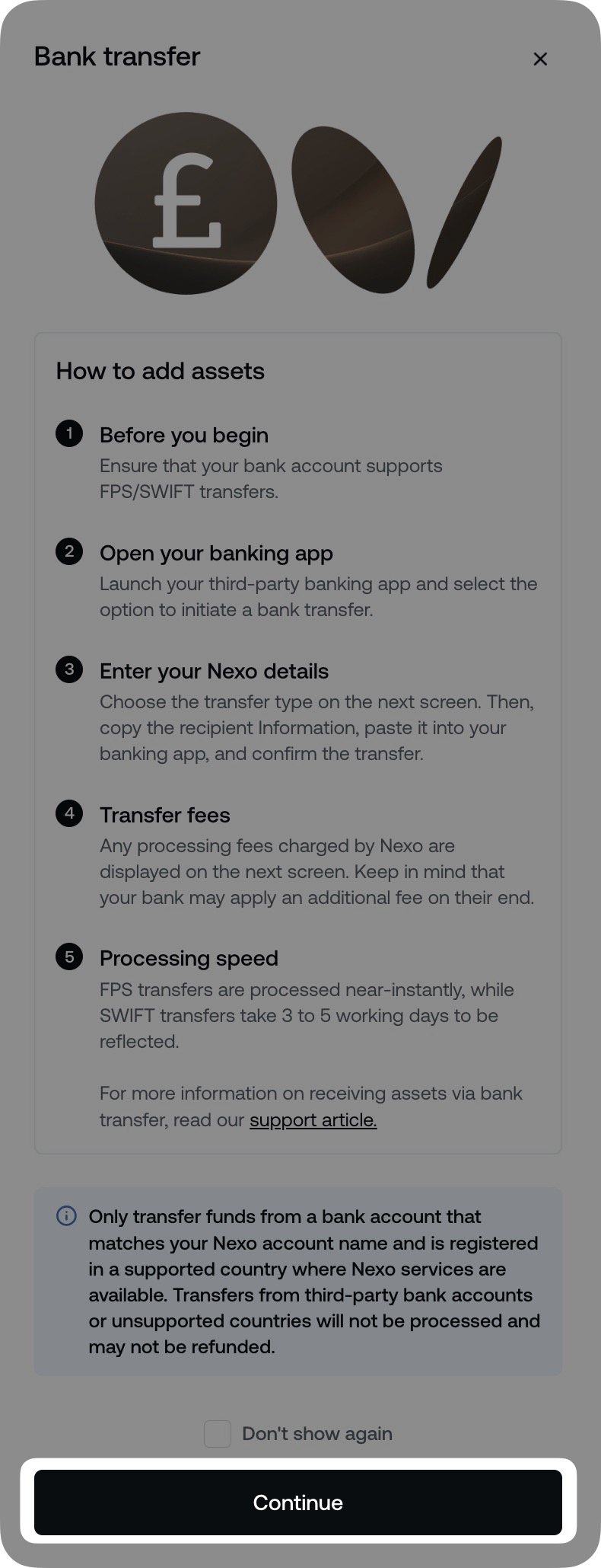 EUR and GBP transfers from third-party bank accounts will not be processed and may not be subject to refund. Ensure you’re transferring EUR and GBP from a bank account that matches the name associated with your Nexo account.
