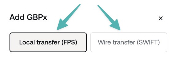 4. Choose between the two available options for GBPx top-ups – FPS or SWIFT.