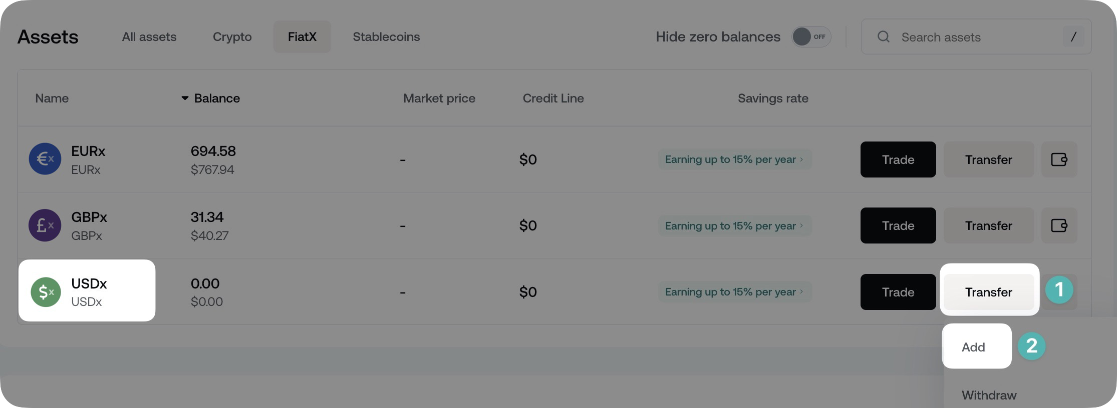 1. Log in and click on the Transfer button for USDx. Then select Add.