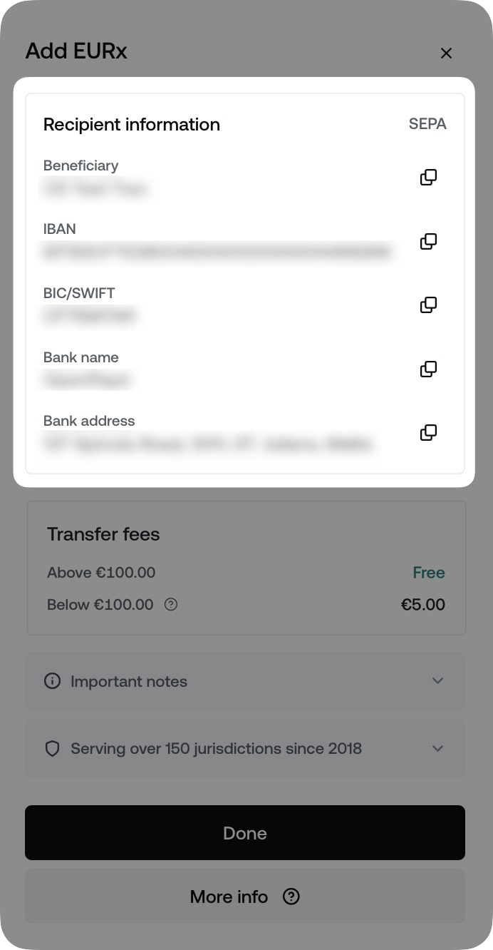 Currently, EURx top-ups are supported only via SEPA. Refer to the step-by-step guide below to top up EURx from your bank account via SEPA, and keep in mind that the minimum transfer is 100 EUR: