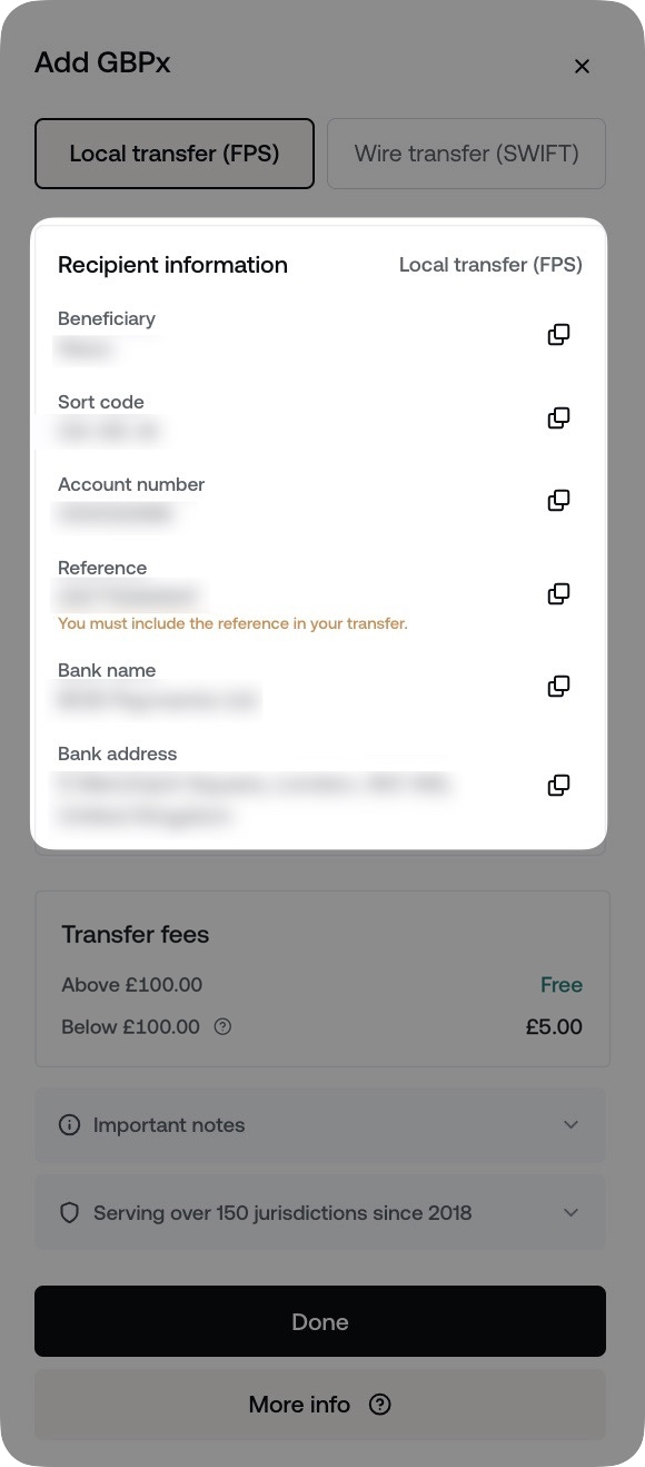 You can choose between two transfer options: FPS or SWIFT. The minimum transfer is 100 GBP for both. Refer to the step-by-step guide below to top up GBPx via a bank transfer: