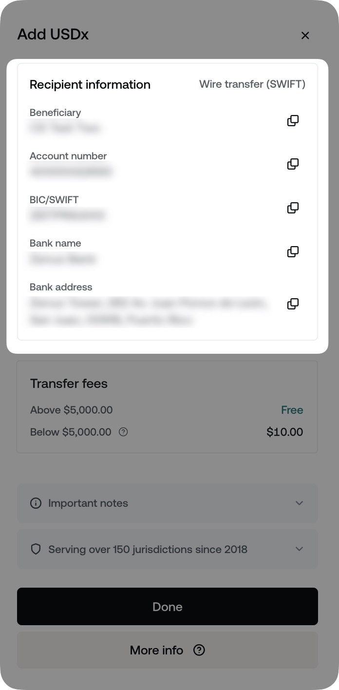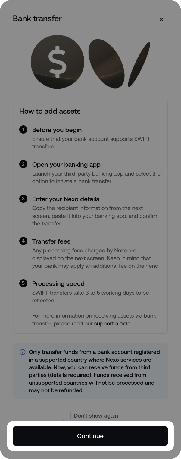 Currently, only SWIFT transfers are supported for USD, and the minimum transfer is 100 USD. Follow the step-by-step guide below to top up USDx to your Nexo account via a bank transfer:
